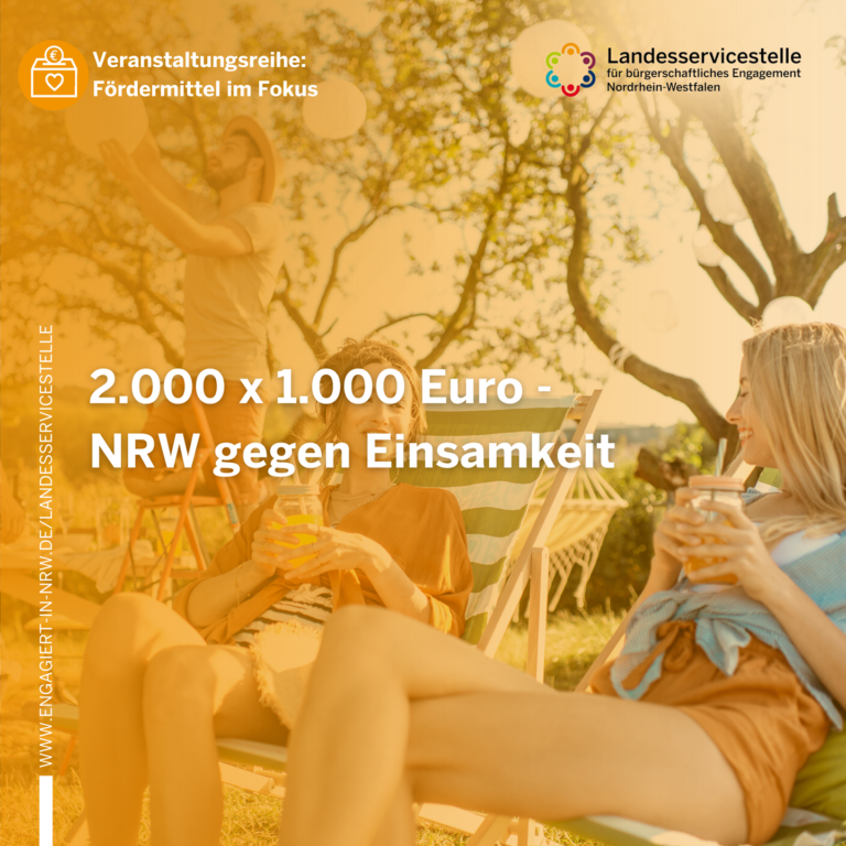 Ihr habt eine vielversprechende Projektidee gegen Einsamkeit entwickelt? Plant einen Ort der Begegnung, um Menschen zusammenzubringen? Wollt euch ganz gezielt mit dem Thema Einsamkeit beschäftigen oder eine Kampagne auf die Beine stellen, um das Miteinander zu stärken und Einsamkeit vorzubeugen? Dafür sucht ihr nun finanzielle Unterstützung? Dann kommt in diese kostenfreie Online-Veranstaltung! Denn hier erfahrt ihr alles über das Förderprogramm „2000 x 1.000 Euro für das Engagement”, den diesjährigen Schwerpunkt „Miteinander engagiert – Du+Wir=Eins. Nordrhein-Westfalen gegen Einsamkeit” und die Antragstellung. Ihr erhaltet hilfreiche Tipps dazu, wie ein hochwertiger Förderantrag aussehen kann und wie die Antragstellung über das Förderportal funktioniert.